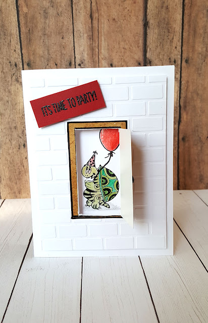 I set the door in the center of my brick paper and traced the inside of the door with a pencil. Then I placed it where I wanted it on my card base. I used a straight edge to cut out my pencil lines going though both layers of the A2 card base and the brick paper. Next, I traced, with a pencil, the door opening to the back page of my card base so I knew where to stamp my image. I used the turtle from the, "Party Animal" Anniversary Stamp Set Release. (You can use any image you would like.) I stamped him with black StazOn and colored him with Leisure Arts Premium Colored Pencils. I then stamped the balloon and drew a string with a black marker.